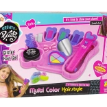 Balenie obsahuje krédy v farbách ružová, zelená a fialová, detskú žehličku na aplikáciu, 6 gumičiek, 3 tampóny na zotretie kriedy, sponku, hrebeň a zrkadielko.