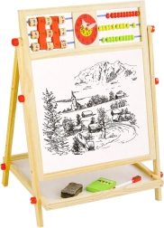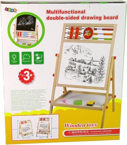 .Obojstranná vzdelávacia kresliaca tabuľa s počítadlom, hodinami a abecedou je mimoriadnou rozvojovou pomôckou pre najmenších. Je vyrobená z masívneho dreva a zaisťuje odolnosť a bezpečnosť pri hre. Jej otočná konštrukcia umožňuje používať dva rôzne povrchy: jeden pokrytý čiernym materiálom, ideálny na maľovanie kriedami, a druhý, biely, ideálny na kreslenie fixkami.