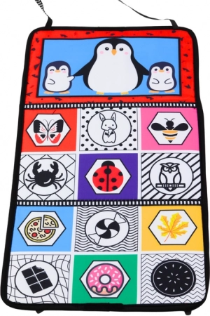 Obojstranná detská hracia podložka poskytuje širokú škálu vizuálnych a motorických stimulov pre vaše dieťa. Vďaka kontrastným vzorom s motívmi zvieratiek a vozidiel napomáha rozvoju vizuálneho vnímania.