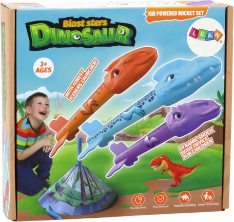 Sada obsahuje tri rakety v tvare dinosaurov v rôznych farbách (oranžová, modrá, fialová), čo zaručuje pestrú hru.
