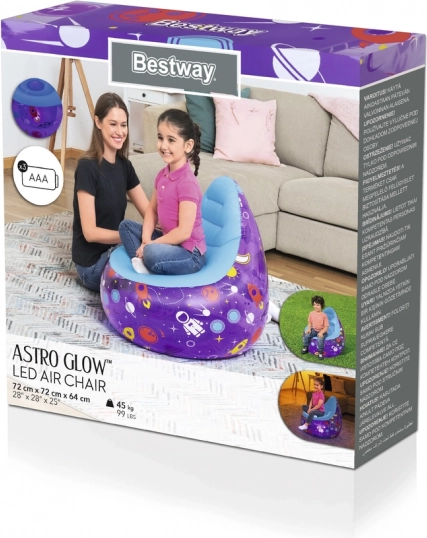 Nafukovacie kreslo Bestway s motívmi vesmíru premení každú detskú izbu či herňu na zábavnú zónu. Integrované LED osvetlenie vytvára príjemnú atmosféru pri čítaní, hraní aj oddychu. Vďaka nízkej hmotnosti je kreslo ľahko prenosné a vhodné aj na terasu či do záhrady.