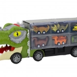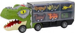 Objavte zábavu s dinosauřím náklaďákom, ktorý kombinuje prepravník autíčok a svet dinosaurov. Prednú časť zdobí veľká hlava dinosaura, nechýbajú svetelné efekty a realistické zvuky náklaďáka či rev dinosaura. V návesu je miesto pre celú zbierku a v balení nájdete 6 vozidiel vrátane 4 dinosauřích autíčok, auta s prívesom a helikoptéry.