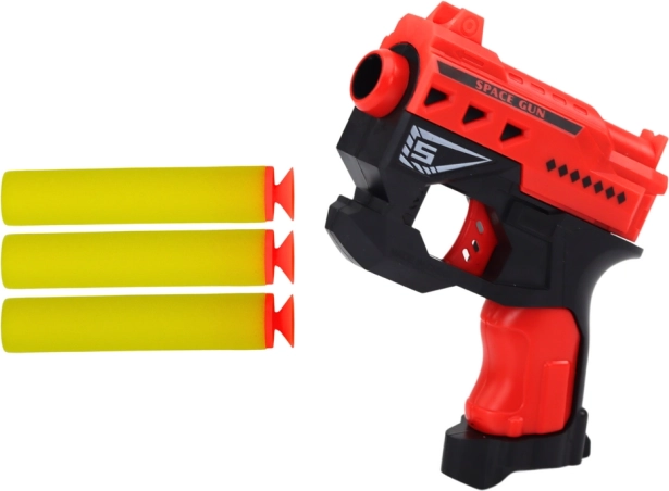 Zábavná a bezpečná hračka pre deti: mini pištoľka na penové šípky s prísavkami vo výraznej červenej farbe. Ľahká konštrukcia, jednoduché ovládanie natiahnutím a stlačením spúšte a 3 šípky s prísavkami pre zábavu doma aj vonku.