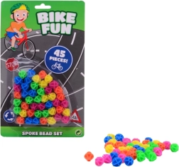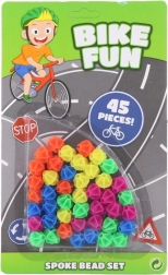 Farebné ozdobné koráliky na bicykel. Materiál plast. Balenie obsahuje 45 korálikov. Po inštalácii sa pohybujú hore a dole podľa pohybu kolesa. Výrobok nie je hračka