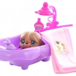 Vanička so sprchou, uterák a „šampón“ umožnia deťom prehrať si každodennú starostlivosť o zvieratko a rozvíjať empatiu aj jemnú motoriku.