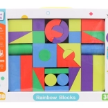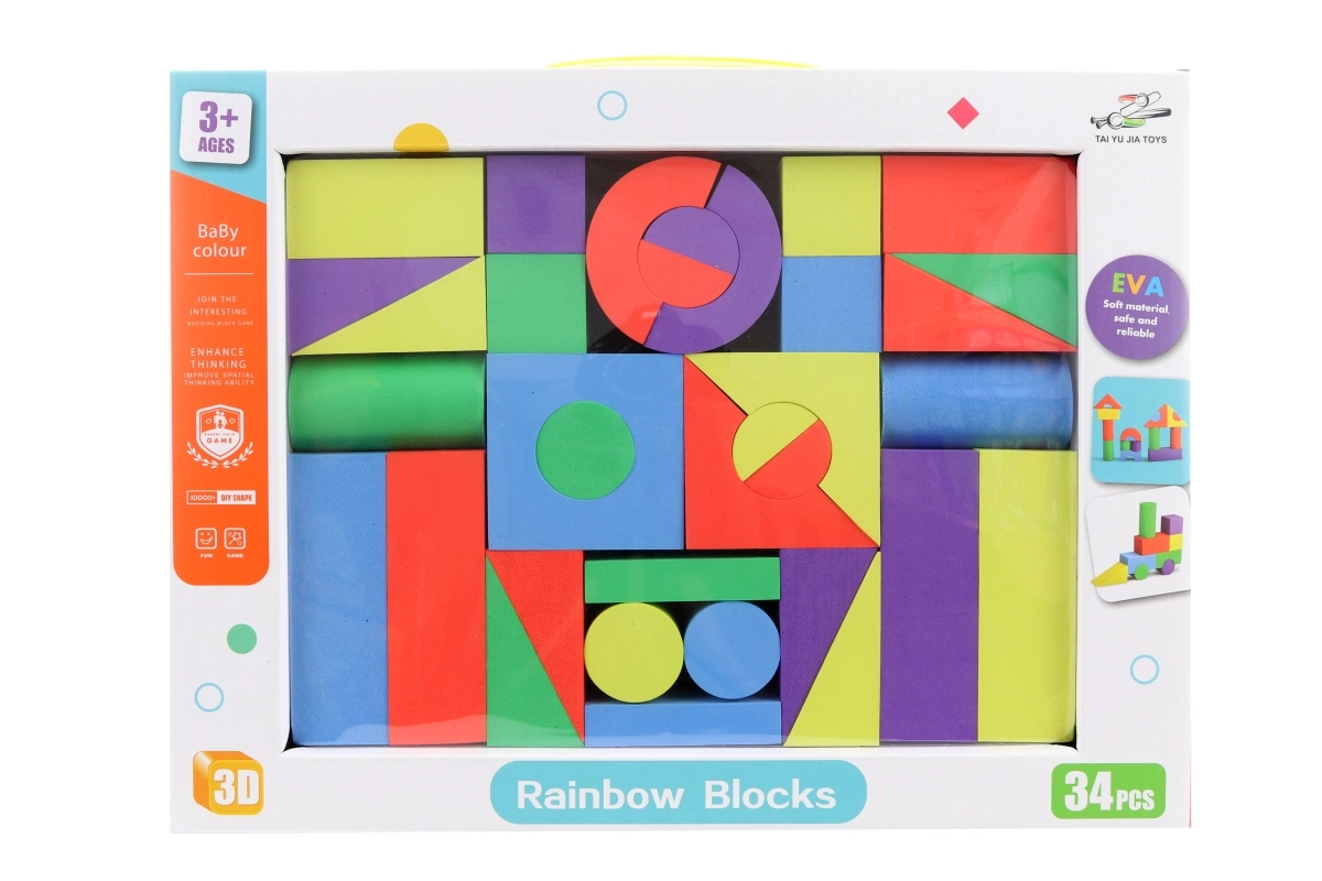 Kocky z tvrdšej peny rôznych tvarov a farieb. Balené v krabici. Rozmery balenia cca 37,5×26,5×4,5 cm. Vek 3+