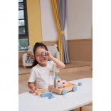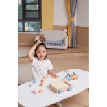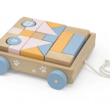Kocky sú vyrobené z bukového dreva, sú natreté v harmonických farbách a zabezpečené pre deti. Po hre môžu byť kocky uložené späť do vozíčka, čo umožňuje jednoduché usporiadanie. Vďaka šnúrke môže dieťa vozík s kockami ťahať pozdĺž podlahy, čo je nielen zábavné, ale aj praktické.