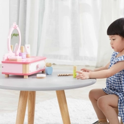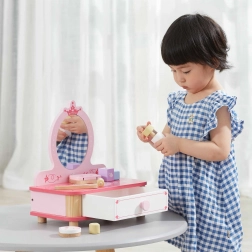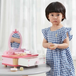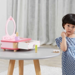 Viga drevená toaletka ponúka zrkadlo a priestrannú zásuvku, kde malé princezné môžu uchovávať svoje poklady. Ružové prevedenie dodáva výrobku elegantný vzhľad a skvele zapadne do detskej izby.