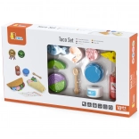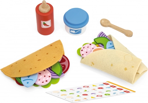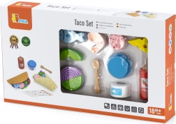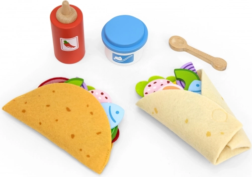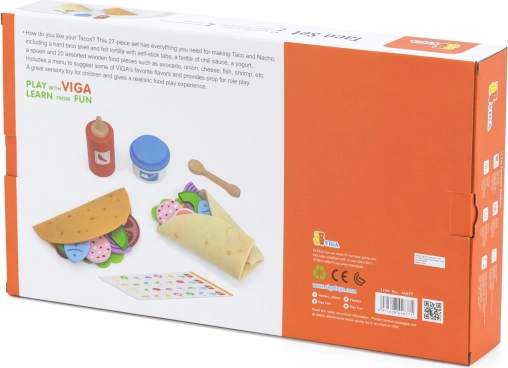 Sada VIGA na taco a burrito prináša deťom autentický zážitok z varenia. Mäkké filcové tortilly a pestré drevené kúsky potravín (zelenina, syr, ryba a i.) nabádajú k miešaniu chutí a tvoreniu vlastných receptov. Vďaka príslušenstvu ako je fľaša omáčky, „jogurt“ miska a drevená lyžička je hra ešte pestrejšia.