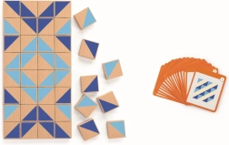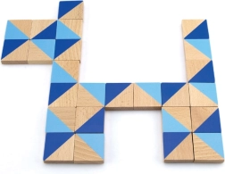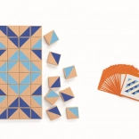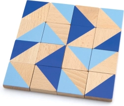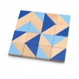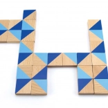 Rozmanité geometrické dieliky v modrých odtieňoch a prírodnom dreve umožňujú skladať nekonečné množstvo obrazcov a vzorov.