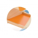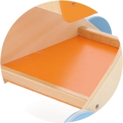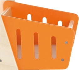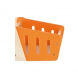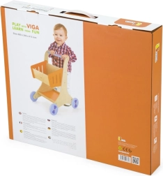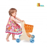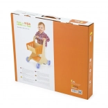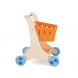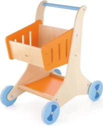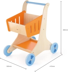 Štýlový drevený nákupný vozík s oranžovým košíkom a modrými kolieskami je ideálny pre prvé krôčiky do sveta rolových hier. Podporuje rozvoj hrubej motoriky, rovnováhy a kreatívnej predstavivosti. Ľahká, stabilná konštrukcia s hladkými hranami je bezpečná pre deti od 12 mesiacov.