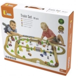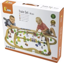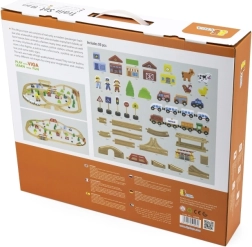 Táto komplexná drevená vláčkodráha prináša deťom všetko, čo potrebujú na vybudovanie vlastného malého sveta. Vďaka 90 dielom môžu malí stavitelia kombinovať rôzne tvary koľají, mosty a križovatky, pridávať dopravné prostriedky, figúrky a prírodné prvky. Prírodné drevo v kombinácii s výraznými farbami pôsobí nadčasovo a podporuje zmyslové vnímanie.