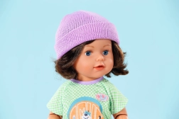 Bábika je oblečená do károvaného trička, nohavíc v džínsovom vzhľade a tenisiek. Fialová čiapka s rozpustenými vlasmi dodáva celkovému vzhľadu štýl.