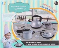 Táto súprava kuchynského riadu je ideálnou hračkou pre deti, ktoré milujú kuchynské aktivity. Obsahuje kanvicu, hrniec, tlakový hrniec, panvicu a ďalšie doplnky, ktoré rozšíria ich fantáziu a zlepšia jemnú motoriku.