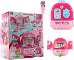 Krásna veľká sada riadov v batohu, ideálna pre malé kuchárky. Táto multifunkčná hračka môže slúžiť ako kuchynská sada, hracia sada s bábikou alebo praktický batoh.