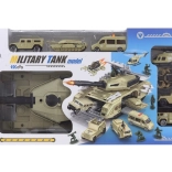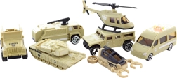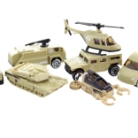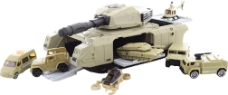 Vojenská sada veľkého tanku so 6 autíčkami a 1 helikoptérou. Materiál plast. Balené v krabici. Rozmery balenia cca 46 × 23,5 × 11 cm. Vek 3+