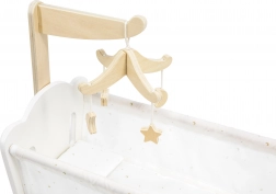 Drevená kolíska pre bábiky PolarB kombinuje nadčasový dizajn, kvalitné spracovanie a jemné textílie s potlačou hviezdičiek a mesiačikov. Integrovaný drevený kolotoč s visiacimi tvarmi dodáva hre kúzlo a pomáha deťom rozvíjať vzťah k starostlivosti a upokojujúcim rituálom.