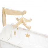 Závesný drevený kolotoč prináša vizuálne podnety a dodáva kolíske čarovnú atmosféru pre upokojujúce rituály pred spaním bábiky.