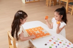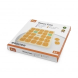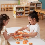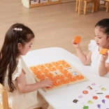 Masívna drevená doska s 25 štvorcovými okienkami a oranžovými krytkami s úchytmi je odolná a pohodlná pre malé detské ruky.