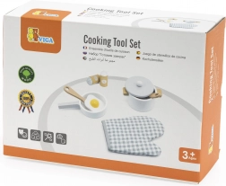 Štýlový drevený kuchynský set od VIGA je ideálny na hru na kuchyňu a rozvoj fantázie, kreativity aj jemnej motoriky. Obsahuje hrniec s pokrievkou, panvicu s volským okom, soľničku a koreničku, špachtľu, lyžicu a kuchynskú chňapku. Vyrobené z kvalitného dreva a maľované netoxickými farbami – bezpečná zábava pre deti od 3 rokov.