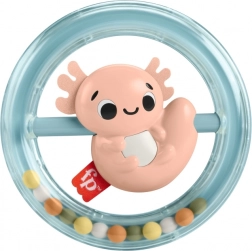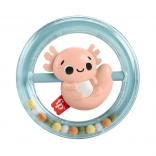 Otáčajúci sa axolotl v priehľadnom kruhu s hrkajúcimi korálkami pre vizuálnu a sluchovú stimuláciu.