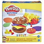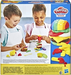 So sadou Play-Doh Kuchyň Burger a Hranolky sa malí kulinárski umelci môžu ponoriť do sveta kreatívneho hrania. Set obsahuje: