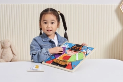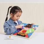 Pod jednotlivými dielmi oblečenia sa skrývajú tematické motívy (králik, karty, holubice, kytica), ktoré rozšíria hru o jednoduché pamäťové hry a rozprávanie príbehov. Tabuľa je inšpirovaná princípmi montessori učenia – podnecuje zvedavosť, podporuje sústredenie a posilňuje sebavedomie dieťaťa.