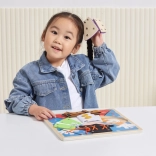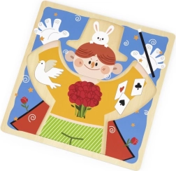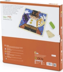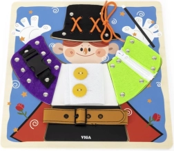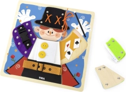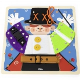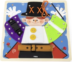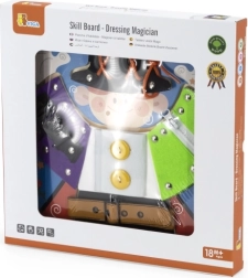 Zábavná drevená tabuľa od značky VIGA s motívom malého kúzelníka učí deti od 18 mesiacov základom obliekania a sebaobsluhy. Pri hre si precvičia zipsy, gombíky, patentky, pracky a šnúrky, rozvíjajú jemnú motoriku, koordináciu oko–ruka aj samostatnosť. Pod oblečením sú navyše ukryté kúzelnícke prvky, ktoré poslúžia ako hravá pamäťová aktivita.