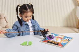 Zipsy, gombíky, patentky, pracky aj šnurovanie – dieťa si vyskúša rôzne typy zapínania a prirodzenou cestou si upevní sebaobslužné zručnosti.