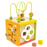 Presúvanie korálikov, triedenie tvarov a vedenie dielikov v labyrinte rozvíjajú koordináciu oko–ruka a prirodzene učia rozpoznávať tvary a farby.