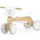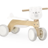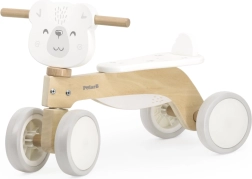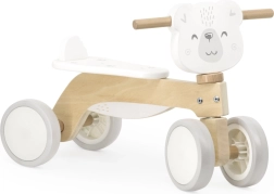 Robustná drevená konštrukcia z kvalitného materiálu je doplnená o zadnú opierku sedla, ktorá bráni zosunutiu dieťaťa dozadu. Ergonomicky tvarované madlo s motívom medvedíka podporuje prirodzený úchop a isté vedenie.