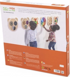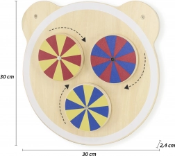 Drevená tabuľa s roztomilou hlavou medvedíka premení každý detský kútik na kreatívnu herňu. Tri farebné kolieska možno ľahko otáčať a pozorovať tak pôsobivé optické efekty, ktoré deti zaujmú a motivujú k ďalšiemu skúmaniu. Tabuľa je ideálna do detskej izby aj do materských škôl a herných kútikov.
