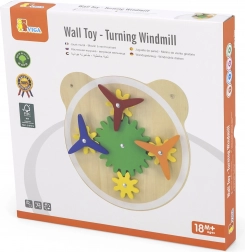 Päť farebných ozubených kolies a tri veterníčky sú navzájom prepojené. Dieťa pochopí princíp príčiny a následku, keď jediným pohybom roztočí celý mechanizmus.