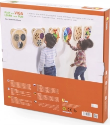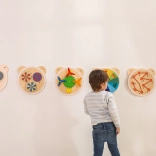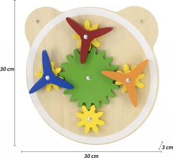 Drevená tabuľa v tvare hlavy medvedíka kombinuje päť prepojených ozubených kolies a tri veterníčky. Deti si hrou osvojujú princíp príčiny a následku: po otočení jedného kolesa sa rozpohybujú všetky. Prirodzene tak trénujú jemnú motoriku, vizuálne vnímanie a tímovú spoluprácu, keď sa striedajú pri jednom paneli.