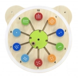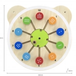 Táto drevená nástenná hra v tvare hlavy medvedíka ponúka deťom hravý spôsob, ako sa naučiť čísla a farby. Posúvaním kruhových kociek s bodkami k zodpovedajúcim čísliciam si deti precvičujú počítanie, zrakové rozlišovanie a koordináciu oko–ruka. Tabuľa je vyrobená z lakovaného dreva a opatrená bezpečnými, netoxickými farbami v živých odtieňoch, ktoré zaujmú na prvý pohľad.