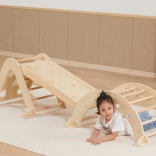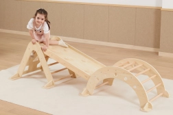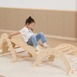 Kvalitné spracovanie z prírodného dreva s hladkými hranami a povrchovou úpravou netoxickými farbami zabezpečuje dlhú životnosť a bezpečie. Oblúk možno kombinovať s ďalšími montessori prvkami (napr. trojuholník či šmykľavka) a vytvoriť tak domáce mini ihrisko.