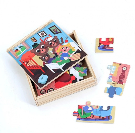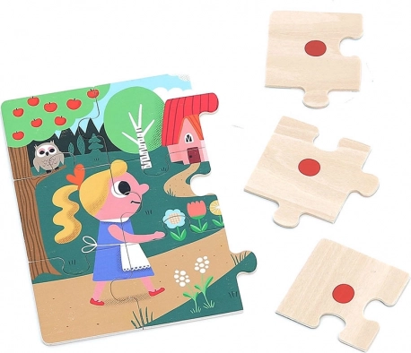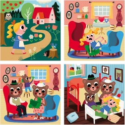 Štyri samostatné puzzle po 9 dielikoch rozprávajú príbeh o Zlatovláske krok za krokom a podporujú detskú fantáziu aj rozprávanie.