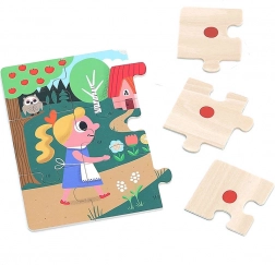 Táto sada obsahuje 4 ilustrované obrázky z príbehu o Zlatovláske, každý zložený z 9 pevných dielikov. Deti si precvičia koncentráciu, pamäť aj trpezlivosť a zároveň si užijú krásne, farebné ilustrácie s retro nádychom od Ingely P. Arrhenius. Vďaka drevenému prevedeniu sú puzzle odolné a vhodné pre malé detské ruky.