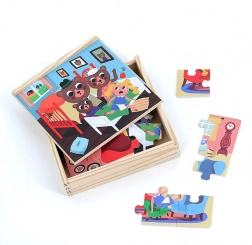 Objavte čarovnú sadu štyroch drevených puzzle s motívom rozprávky o Zlatovláske. Každé puzzle má 9 dielikov a je uložené v praktickej drevenej krabičke s bavlnenou rukoväťou. Rozvíja jemnú motoriku, logické myslenie a súvislé rozprávanie. Farebné bodky na zadnej strane dielikov uľahčujú triedenie, nádherné ilustrácie od Ingely P. Arrhenius zaujmú deti na prvý pohľad.