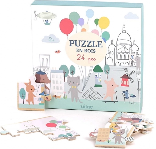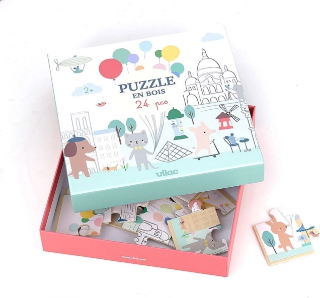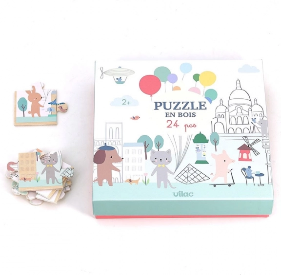 Preneste sa do malebných ulíc Paríža a nechajte deti objavovať svet fantázie s panoramatickými drevenými puzzle Vilac. Ilustrácie od Sarah Betz prinášajú roztomilé zvieratká a detaily, ktoré deti zaujmú na prvý pohľad. Každý dielik je vyrobený z kvalitného dreva, má hladké hrany a je navrhnutý pre malé detské ruky.
