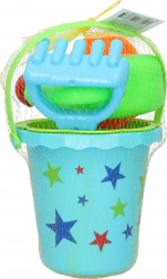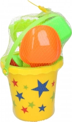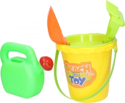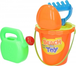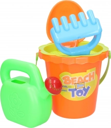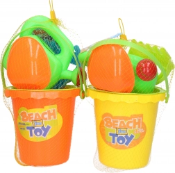 Praktická detská súprava na piesok s veľkosťou 15 cm obsahuje všetko, čo malí stavitelia potrebujú: vedierko, sitko, kanvičku, hrabličky a lopatku. K dispozícii sú 2 farebné varianty – žltá a oranžová. Skvelé na ihrisko, pláž aj do záhrady.