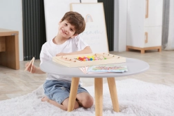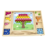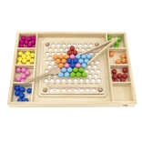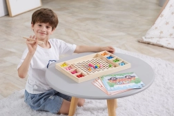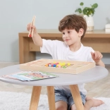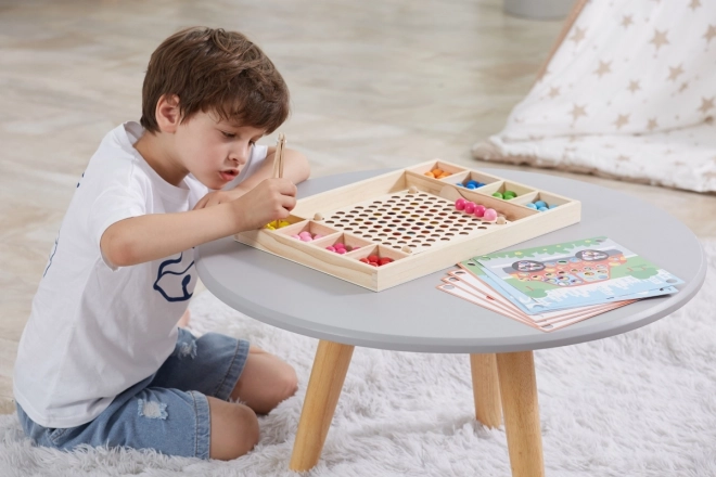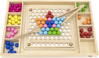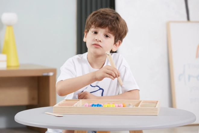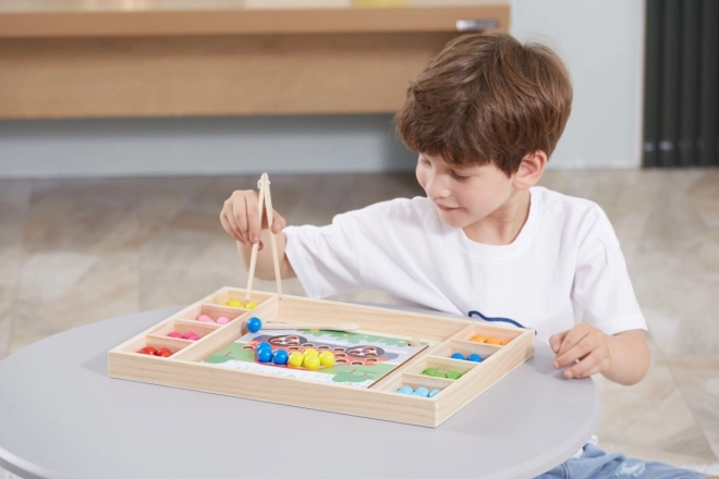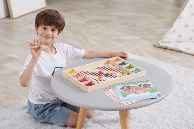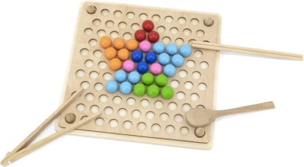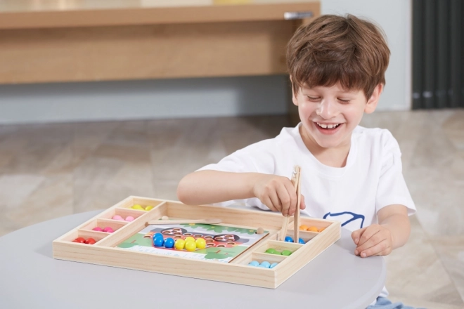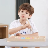 Drevená vzdelávacia hra "Chyť a Zoraď" umožňuje deťom skúšať rôzne vzory a farby podľa priložených papierov alebo ich vlastnej fantázie. S touto hrou deti majú možnosť pripevniť papier na drevený podnos a za použitia paličiek, lyžice alebo klipu vkladať farebné guľôčky do otvorov na doske. Nakoniec deti môžu vytvoriť krásne obrázky.