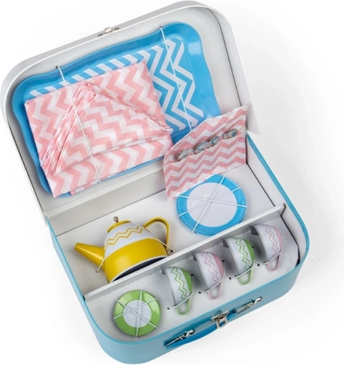Táto kovová detská čajová súprava od BIGJIGS TOYS je uložená v pevnom kartónovom kufríku, takže si ju deti môžu vziať kamkoľvek. Odolné prevedenie z kovu zabezpečí dlhú životnosť a bezpečné hranie.