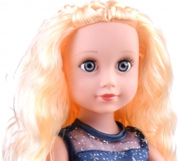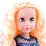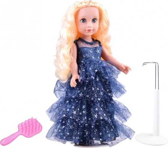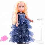 Elegantná bábika s dlhými blond vlasmi v nádherných modrých šatách posiatych hviezdami prináša hodiny kreatívnej zábavy. Má pohyblivé ruky, nohy aj hlavu, je celá z odolného plastu a súčasťou je stojan a hrebeň na ľahké česanie a vystavenie.