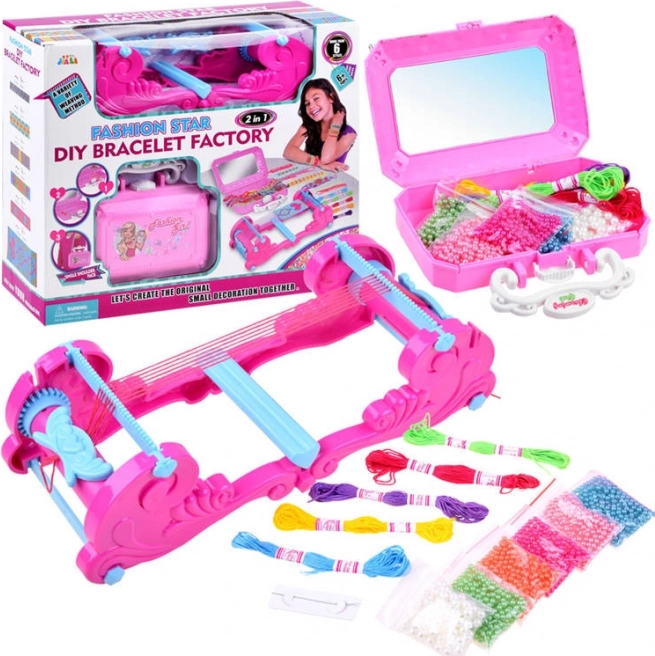 Rozvíjajte detskú kreativitu s touto továreňou na výrobu náramkov. Sada obsahuje stav na pletenie, farebné mulinky, koráliky a perlovú šnúrku na tvorbu originálnych šperkov, ktoré podporia jemnú motoriku aj fantáziu.