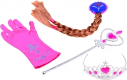 Tmavomodrá ozdobná spona do vlasov s pripevnenými dlhými gaštanovými copy sa jednoducho nasadzuje a hlavne vám pomôže pripodobniť sa krásnej princeznej z obľúbenej rozprávky. Korunka a žezlo sú nevyhnutným doplnkom každej kráľovnej, princeznej alebo princeznej, preto boli dômyselne vyrobené a krásne zdobené ružovými plastovými kryštálmi. Ružová rukavička s krásnym elegantným zdobením krásne doplní outfit malej dievčatka.