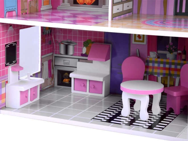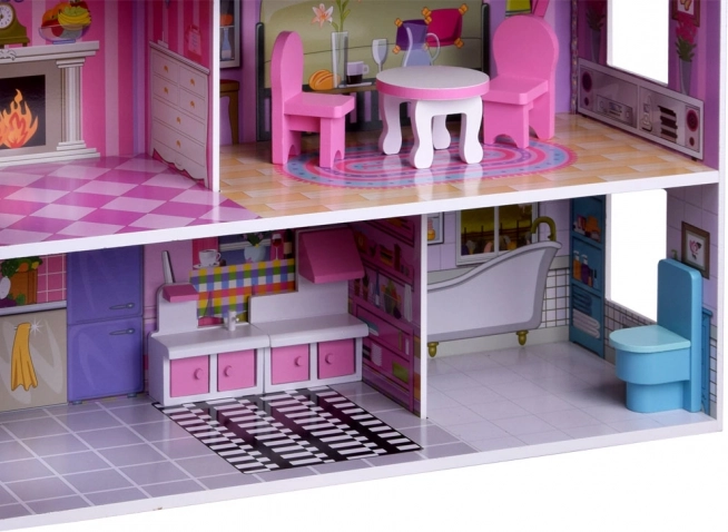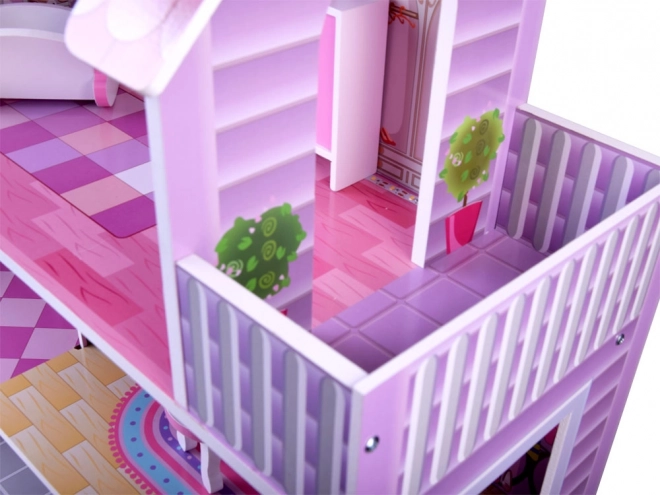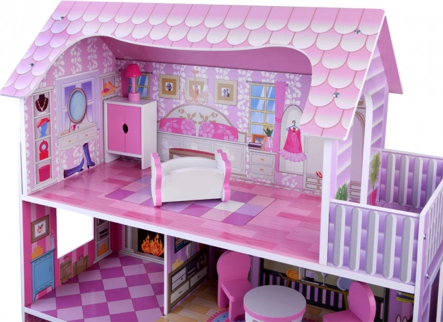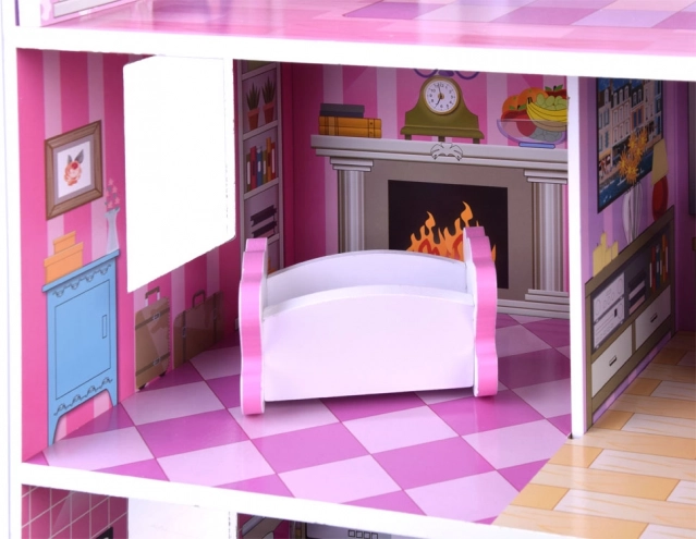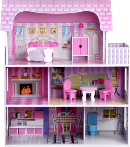 Ružovo‑fialový drevený domček pre bábiky očarí detailnými ilustráciami a otvorenou architektúrou pre ľahký prístup do každej miestnosti. Tri poschodia ponúkajú päť plne vybavených zón a terasu, ktoré pozývajú k dlhým hodinám imaginatívnej hry. Vďaka stabilnej drevenej konštrukcii a premysleným proporciám je ideálnym centrom detskej izby.