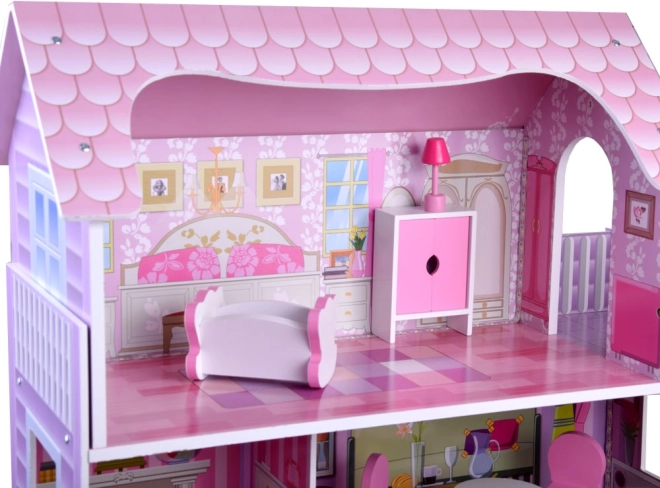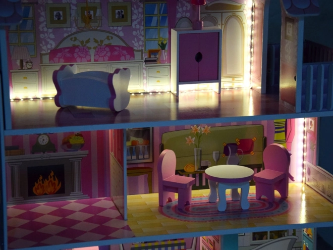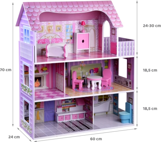 Elegantný drevený domček pre bábiky s 3 poschodiami a 5 miestnosťami, bohatou súpravou nábytku a jemným LED osvetlením. Pevná konštrukcia, rozmery 70 × 60 × 24 cm a jednoduchá montáž do 30 minút podporujú kreatívnu hru s bábikami typu BARBIE a ANLILY.
