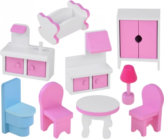 - Súprava nábytku: kredenc s digestorom a otváracími dvierkami, kúpeľňová skrinka s dvierkami, modré WC, biely okrúhly stôl, 2 ružové stoličky, biela šatníková skriňa s ružovými dvierkami, kolíska, nočná lampička a LED svetlá.
