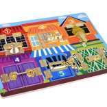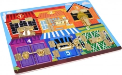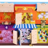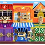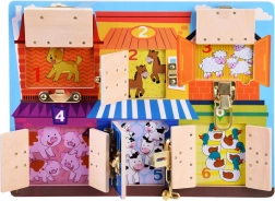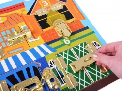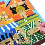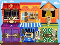 Táto interaktívna manipulačná tabuľa ponúkne deťom veľa zábavy aj učenia v jednom. Každý farebný domček je označený číslom a ukrýva za dvierkami zvieratká v počte zodpovedajúcom danému číslu. Deti si tak precvičia počítanie, rozpoznávanie farieb aj logické myslenie, zatiaľ čo otváranie rôznych zámkov posilní jemnú motoriku a koordináciu oko–ruka.
